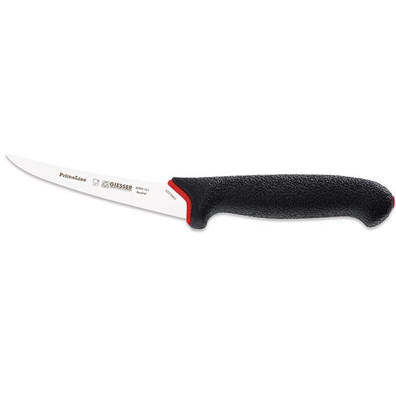Giesser Boning Knife with a Curved Stiff Narrow Blade and a Soft Shell Black Handle. The Primeline Range from Giesser with its High quality vacuum hardened steel blade with 3 times sharpened and polished cutting edge - Provides an industry leading combination of initial sharpness and cutting edge retentionhave a soft coated solid core handles.